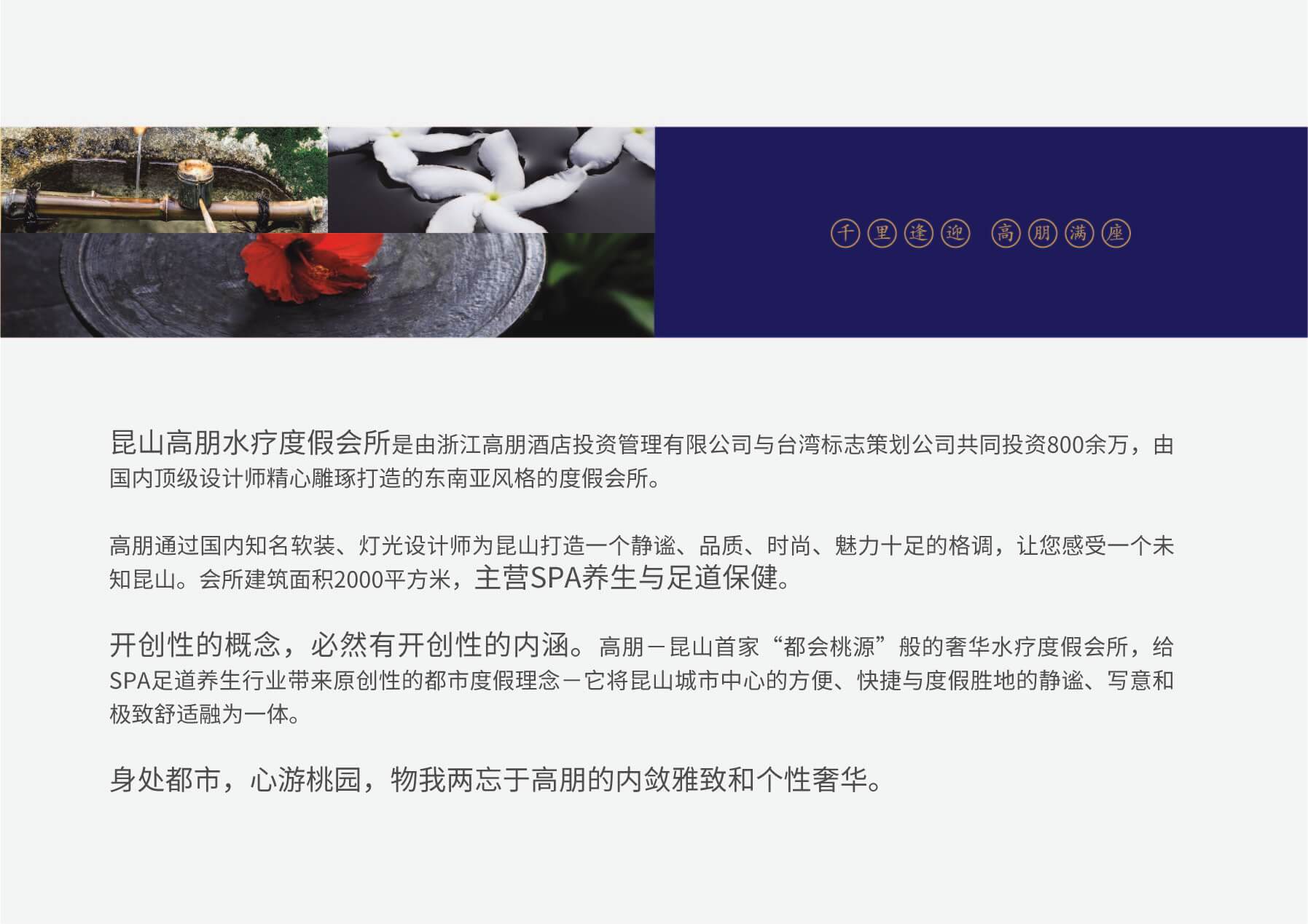 開創(chuàng)性的概念,開創(chuàng)性的內(nèi)涵,高朋-昆山首家“都會(huì)桃源”般的奢華水療度假會(huì)所,給SPA足道養(yǎng)生行業(yè)帶來原創(chuàng)性的都市度假理念-它將昆山城市中心的方便、快捷與度假勝地的靜謐、寫意和極致舒適融為一體。